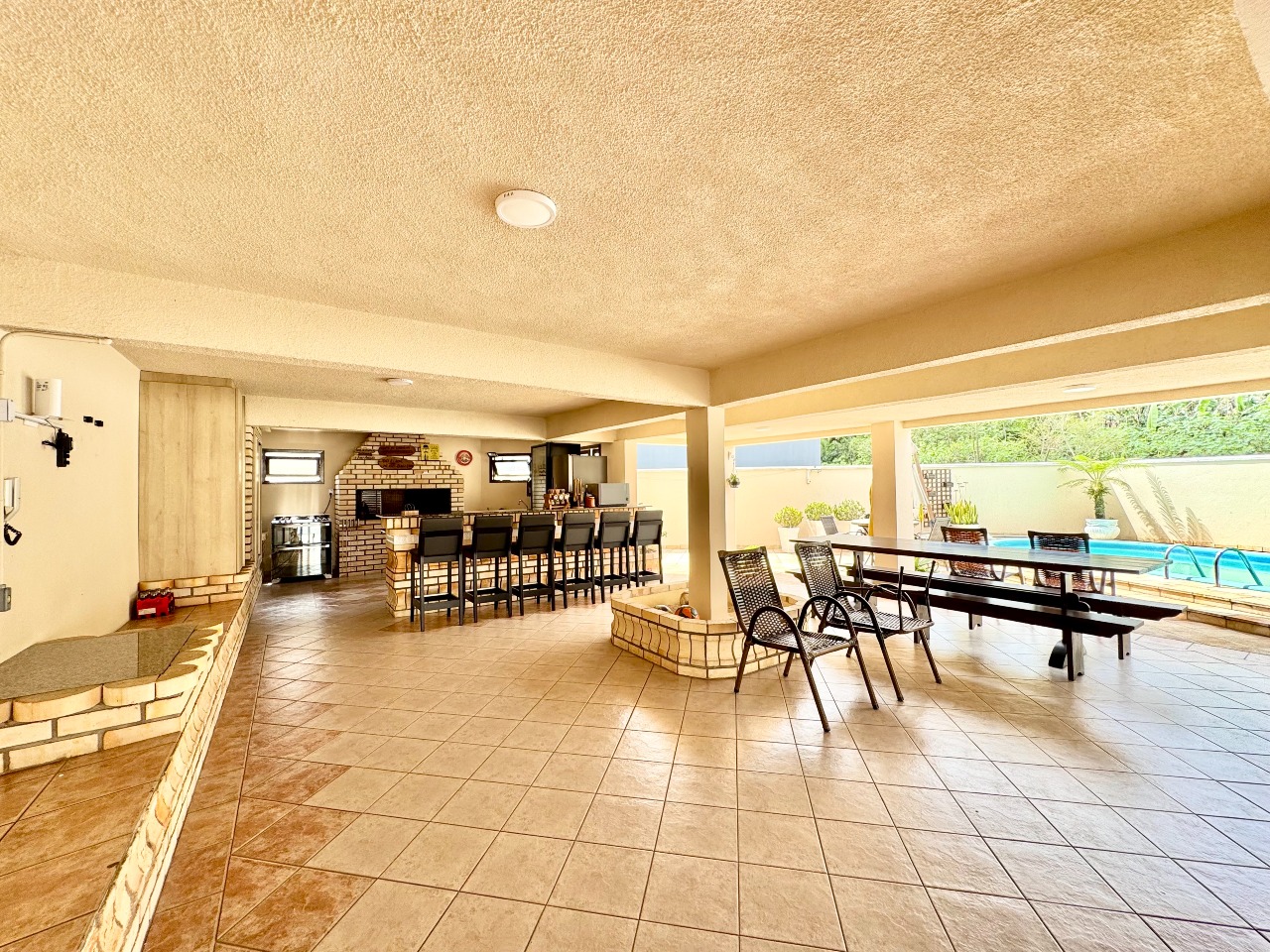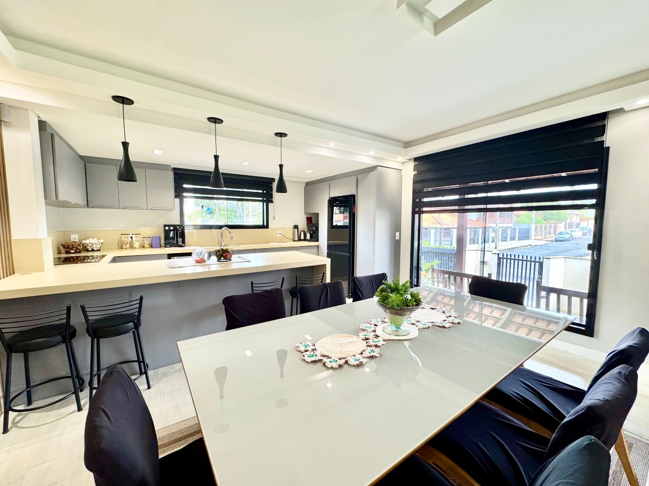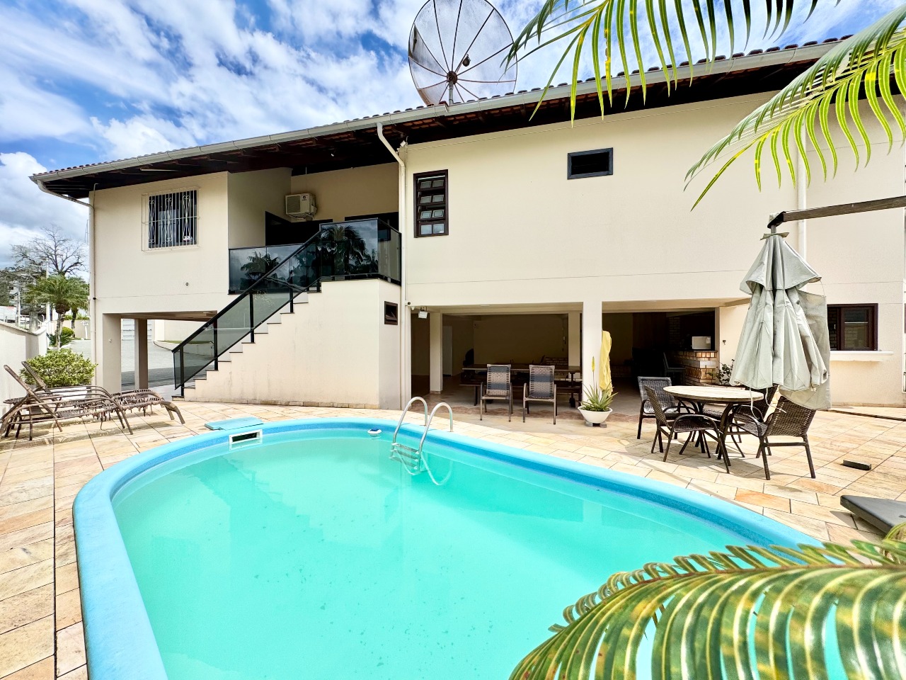 O terreno conta com 827,54m², sendo 420,48m² de área construída, distribuídos em 4 dormitórios, sendo 2 suítes, e uma delas com closet, 5 banheiros, 2 salas, cozinha e 4 vagas de garagem coberta. Para quem valoriza momentos de lazer, a casa oferece um amplo espaço de festas com churrasqueira, piscina, pátio com capacidade para acomodar mais carros e ainda uma área gramada encantadora, perfeita para aproveitar os dias ao ar livre.