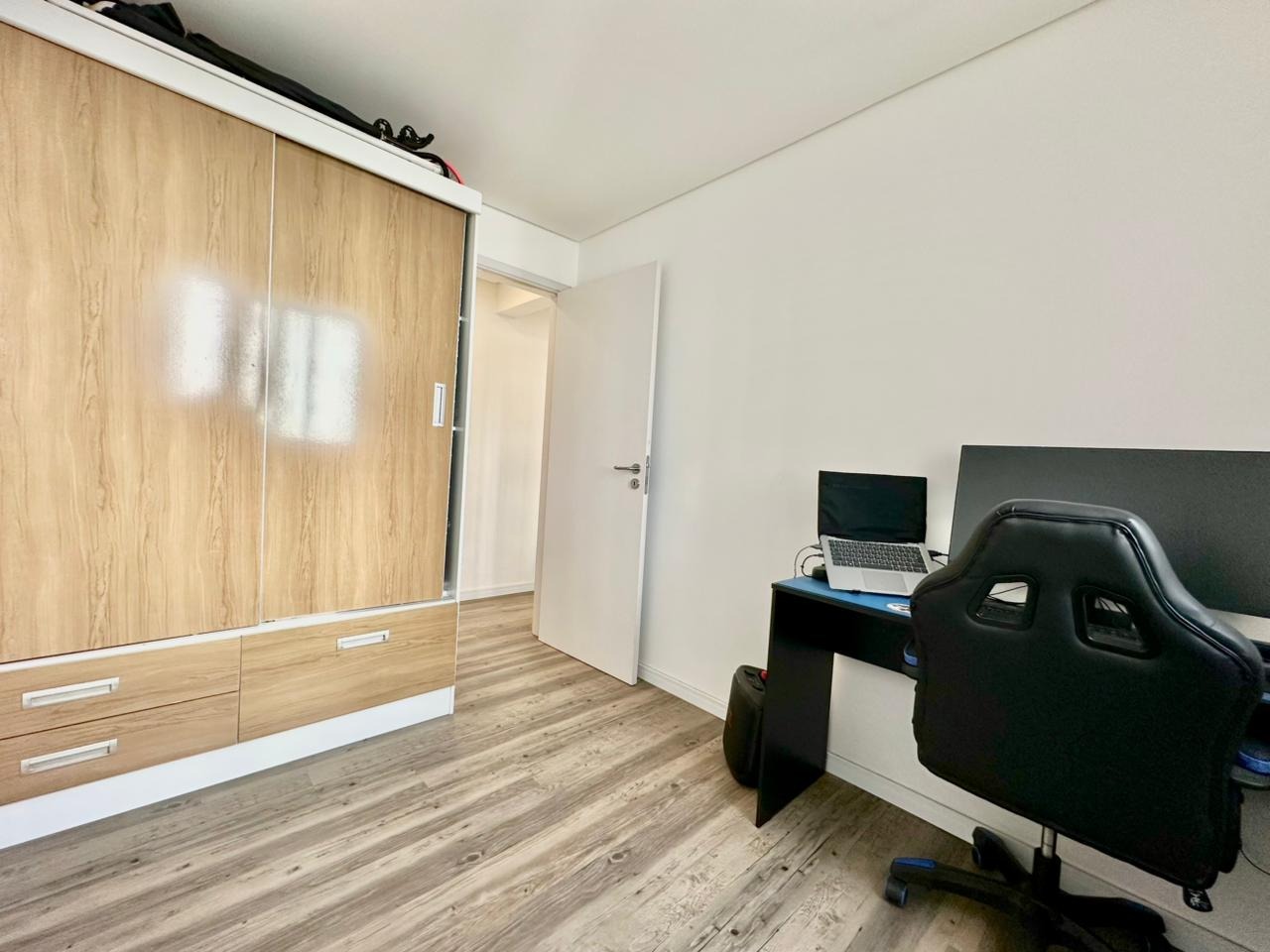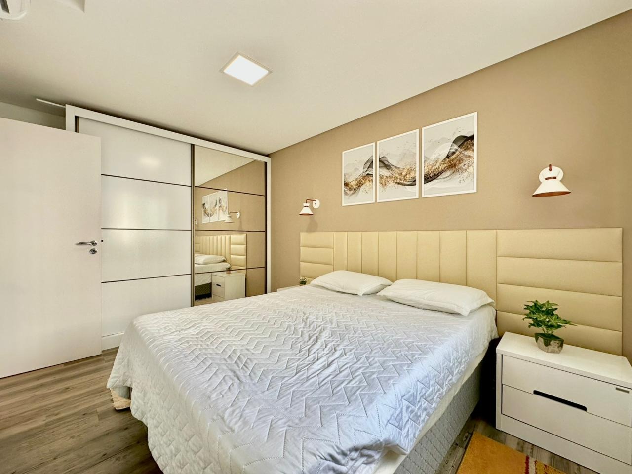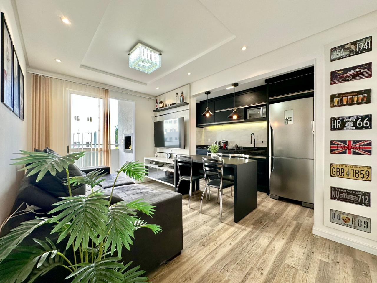 O imóvel é composto por dois dormitórios, sala de estar, cozinha, lavanderia, sacada com churrasqueira e uma vaga de garagem. Será entregue totalmente mobiliado e equipado. Os acabamentos incluem rebaixo em gesso e piso vinílico, que valorizam os ambientes e garantem um visual moderno e aconchegante.