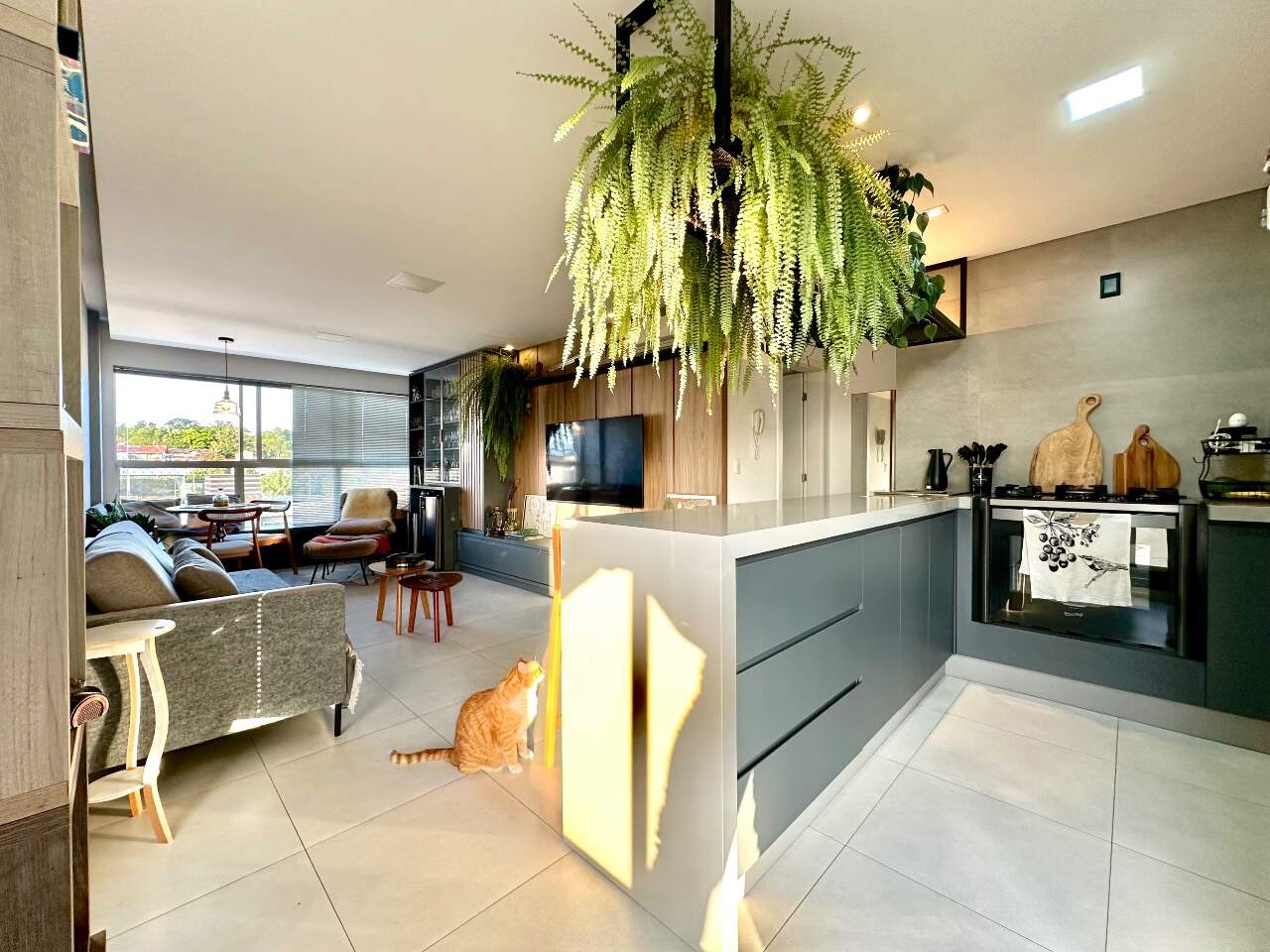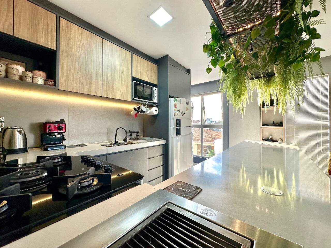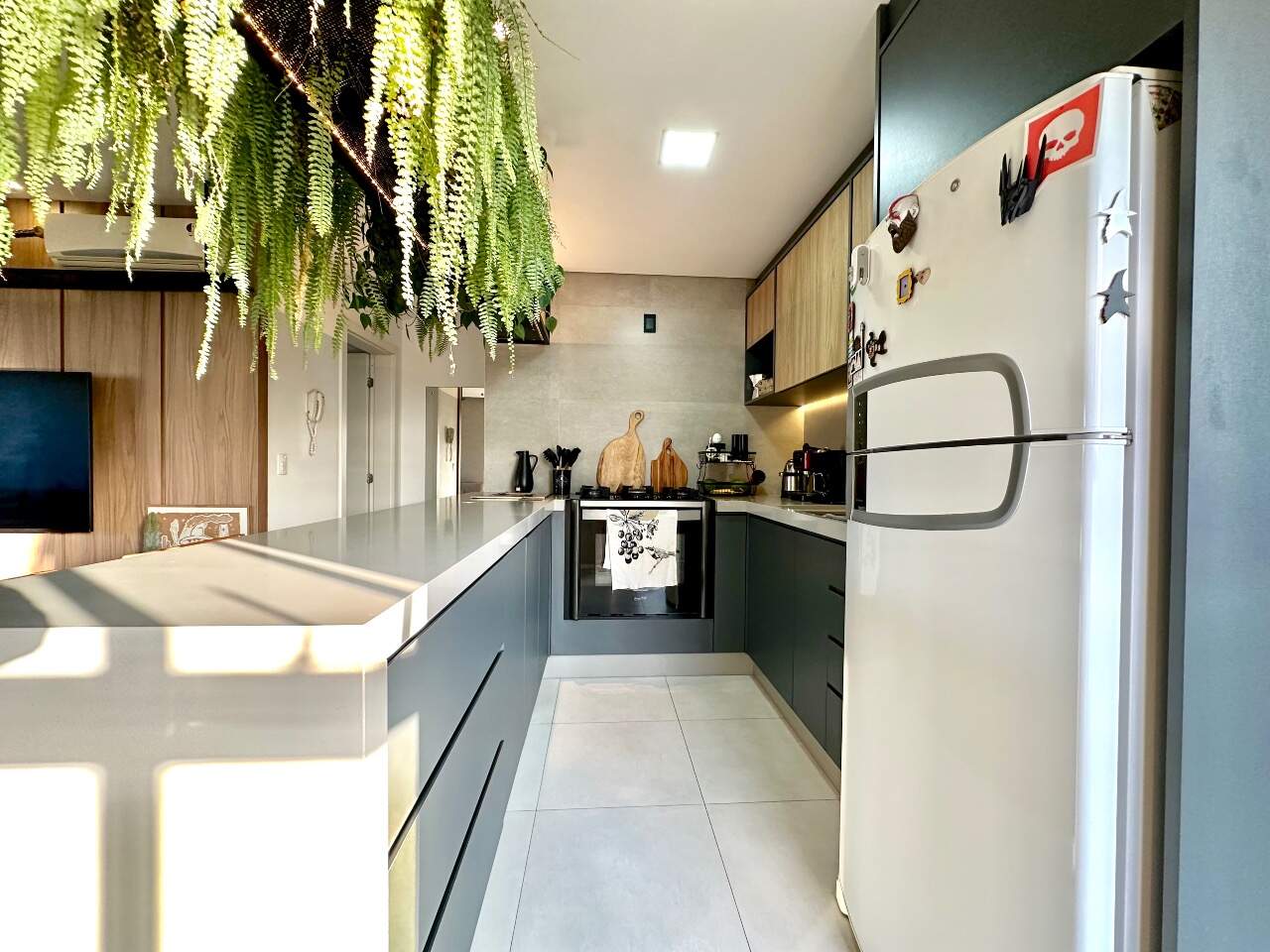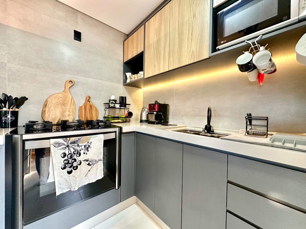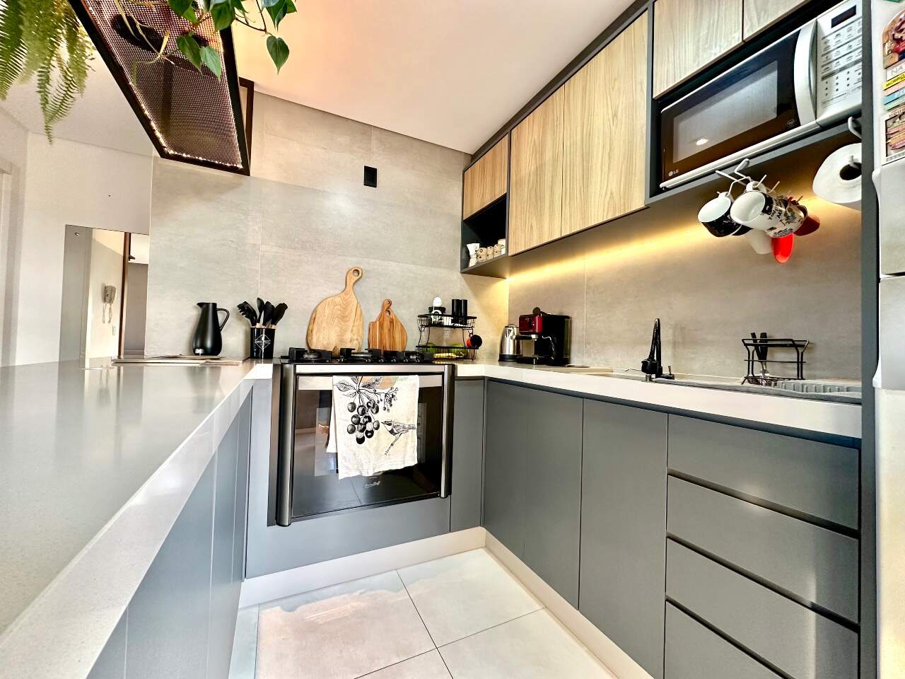 Será entregue muito bem equipado, com móveis sob medida na sala, cozinha e dormitório, fogão embutido, churrasqueira integrada à cozinha e ares-condicionados instalados. O acabamento também se destaca, com porcelanato nas áreas sociais e banheiros, piso vinílico nos dormitórios e rebaixo em gesso, garantindo elegância e modernidade aos ambientes.