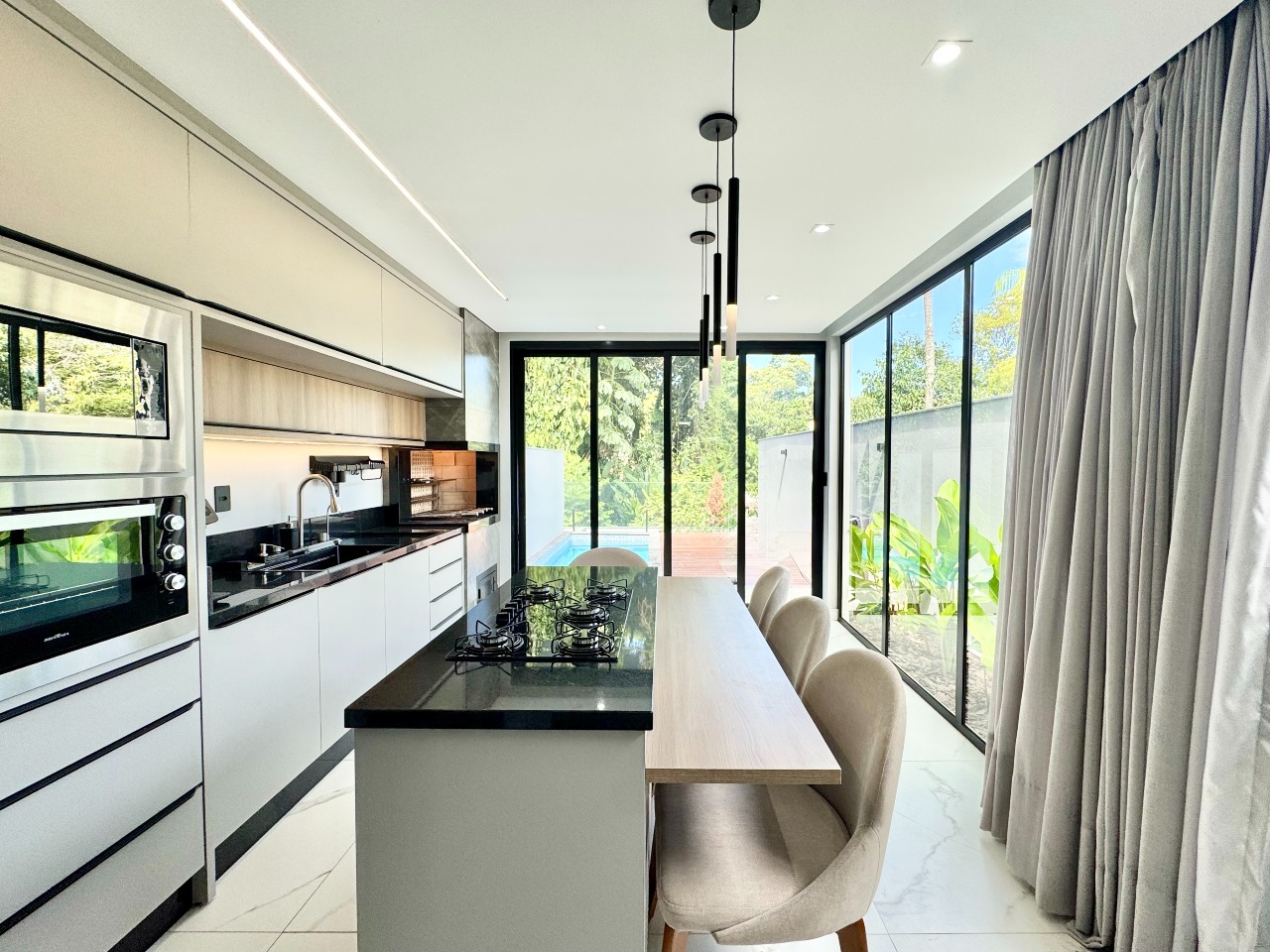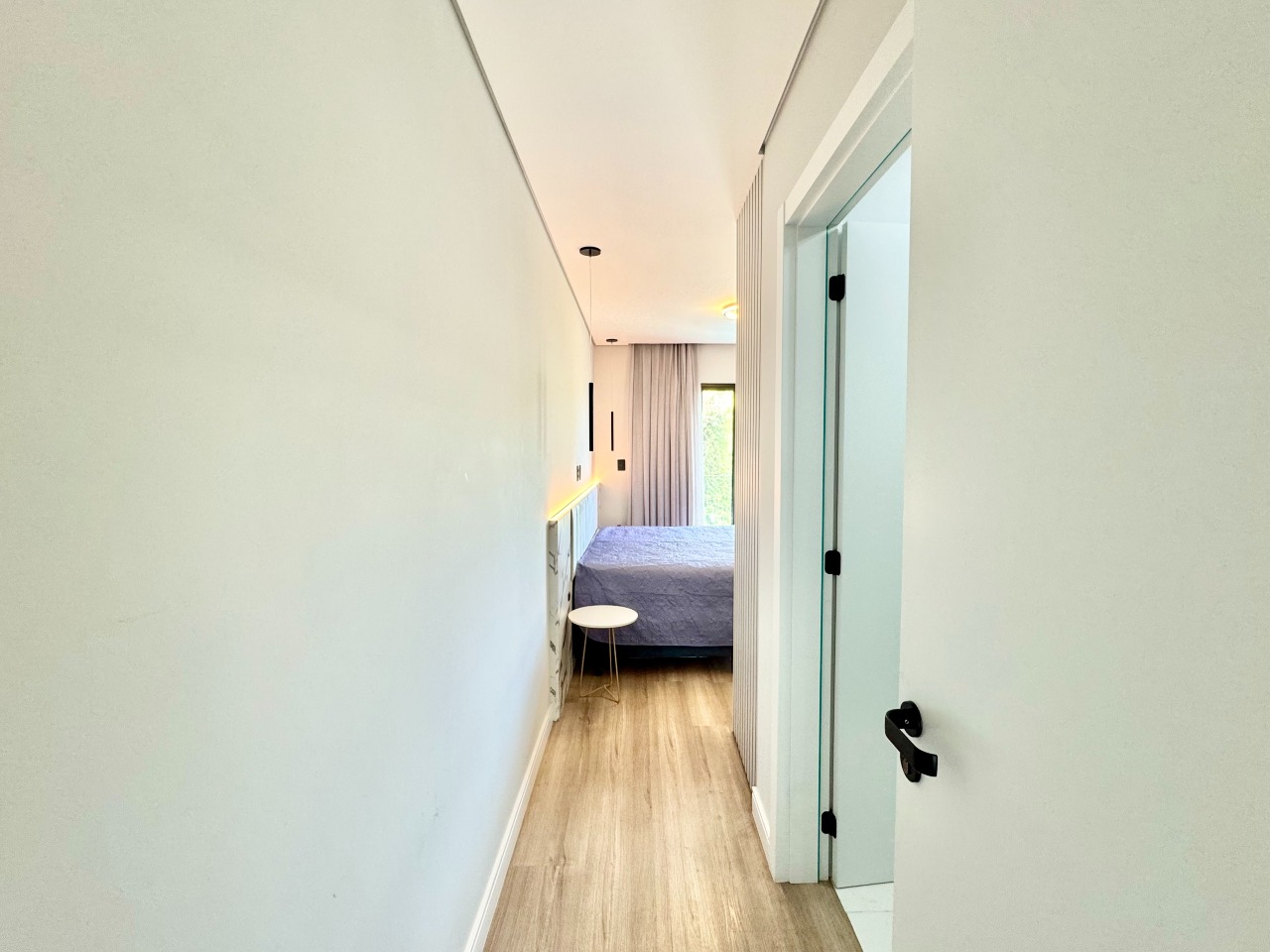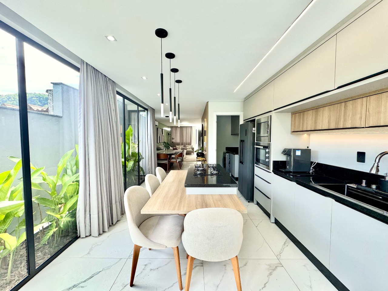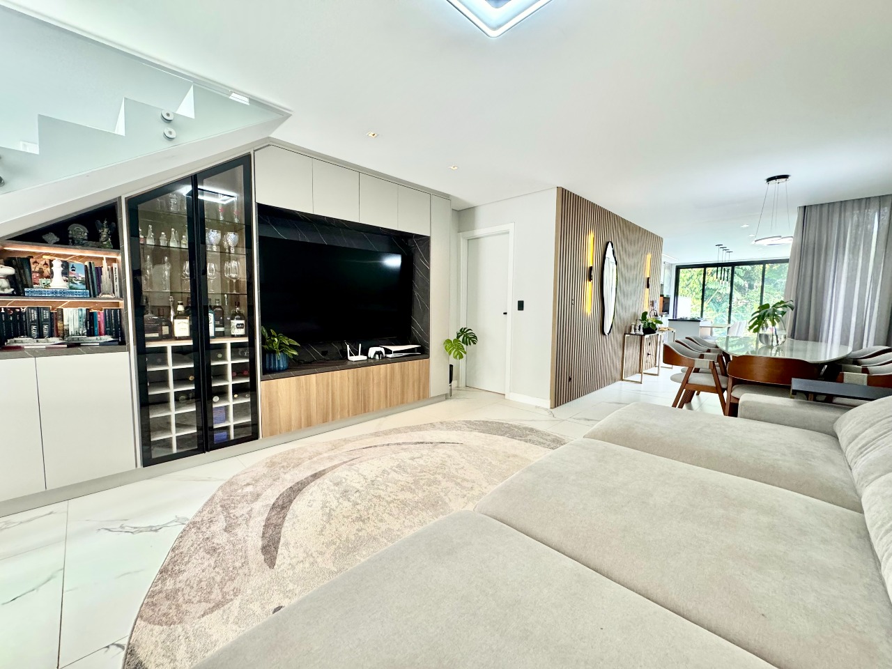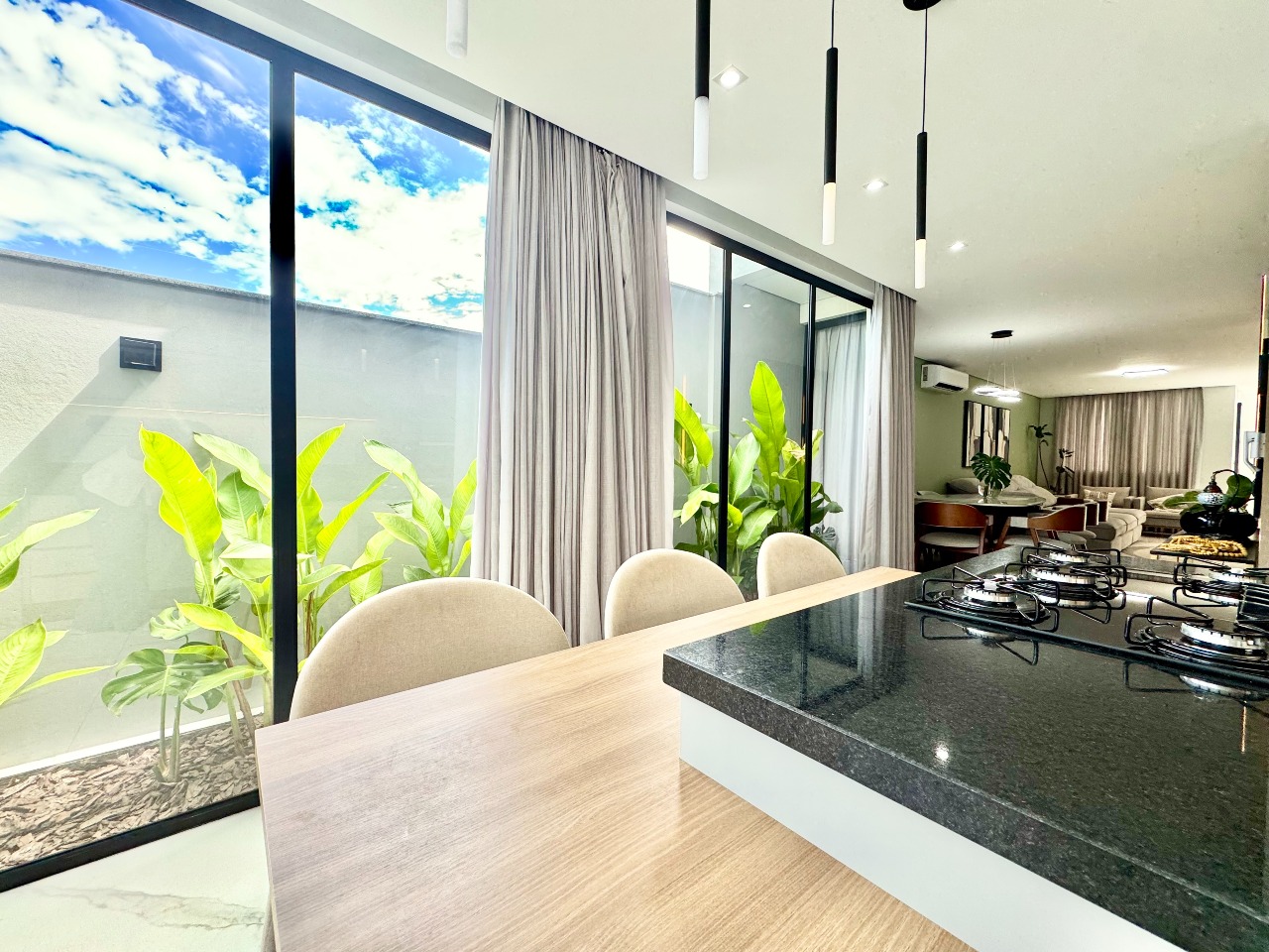 Os acabamentos evidenciam o cuidado na construção, com rebaixo em gesso, piso porcelanato nas áreas sociais, piso laminado no pavimento superior e portas brancas que reforçam a sofisticação dos ambientes.