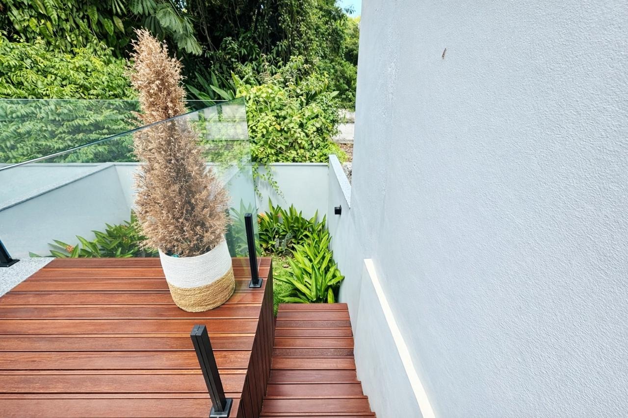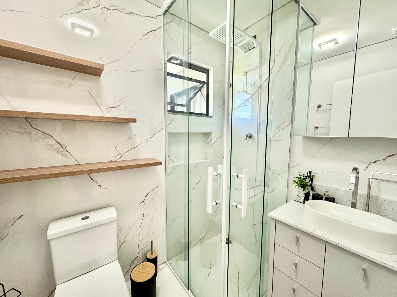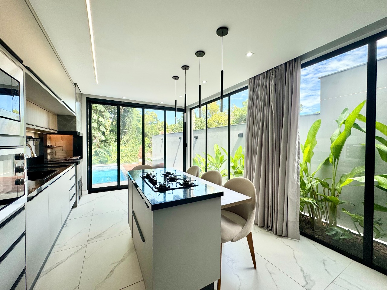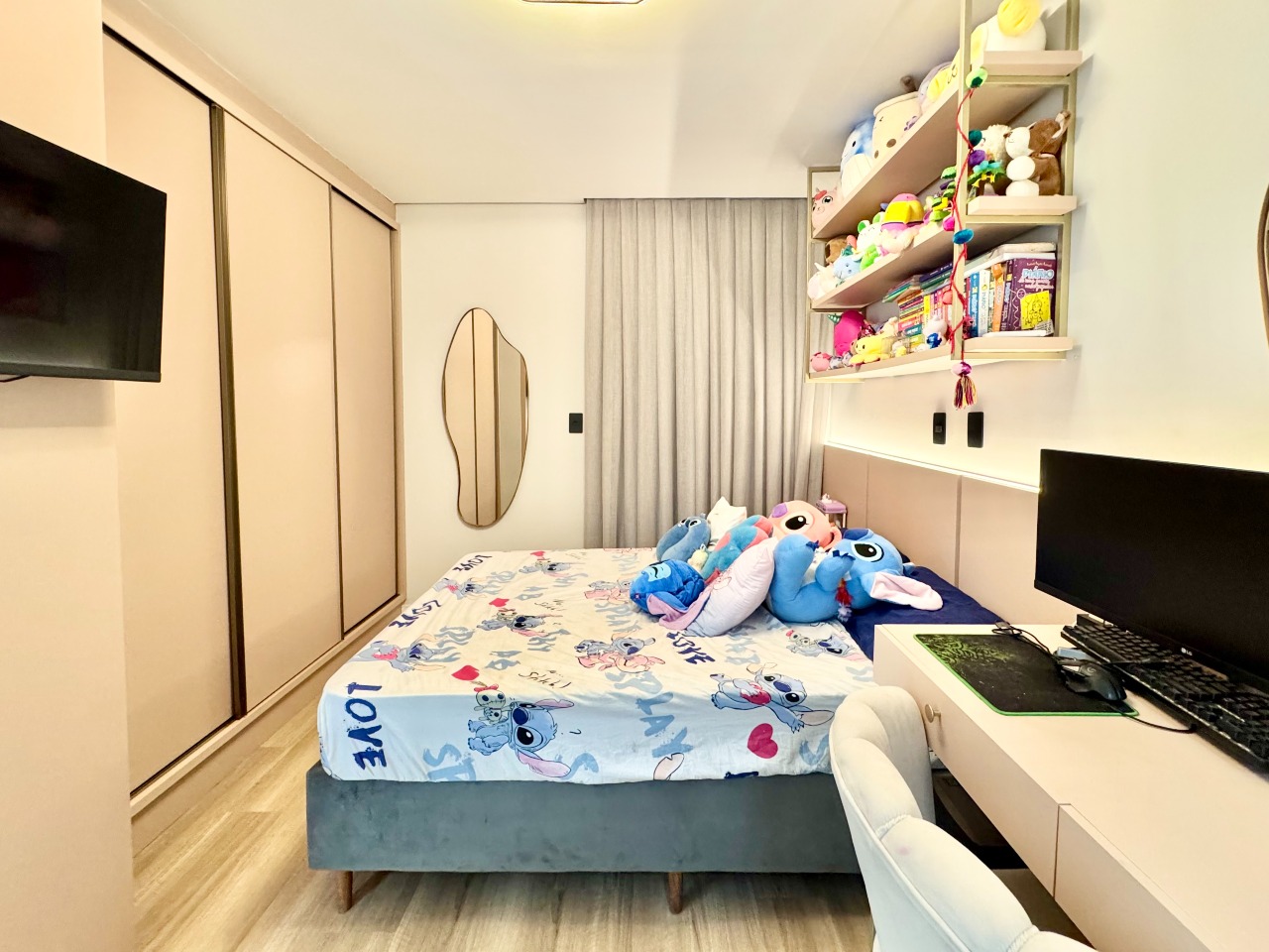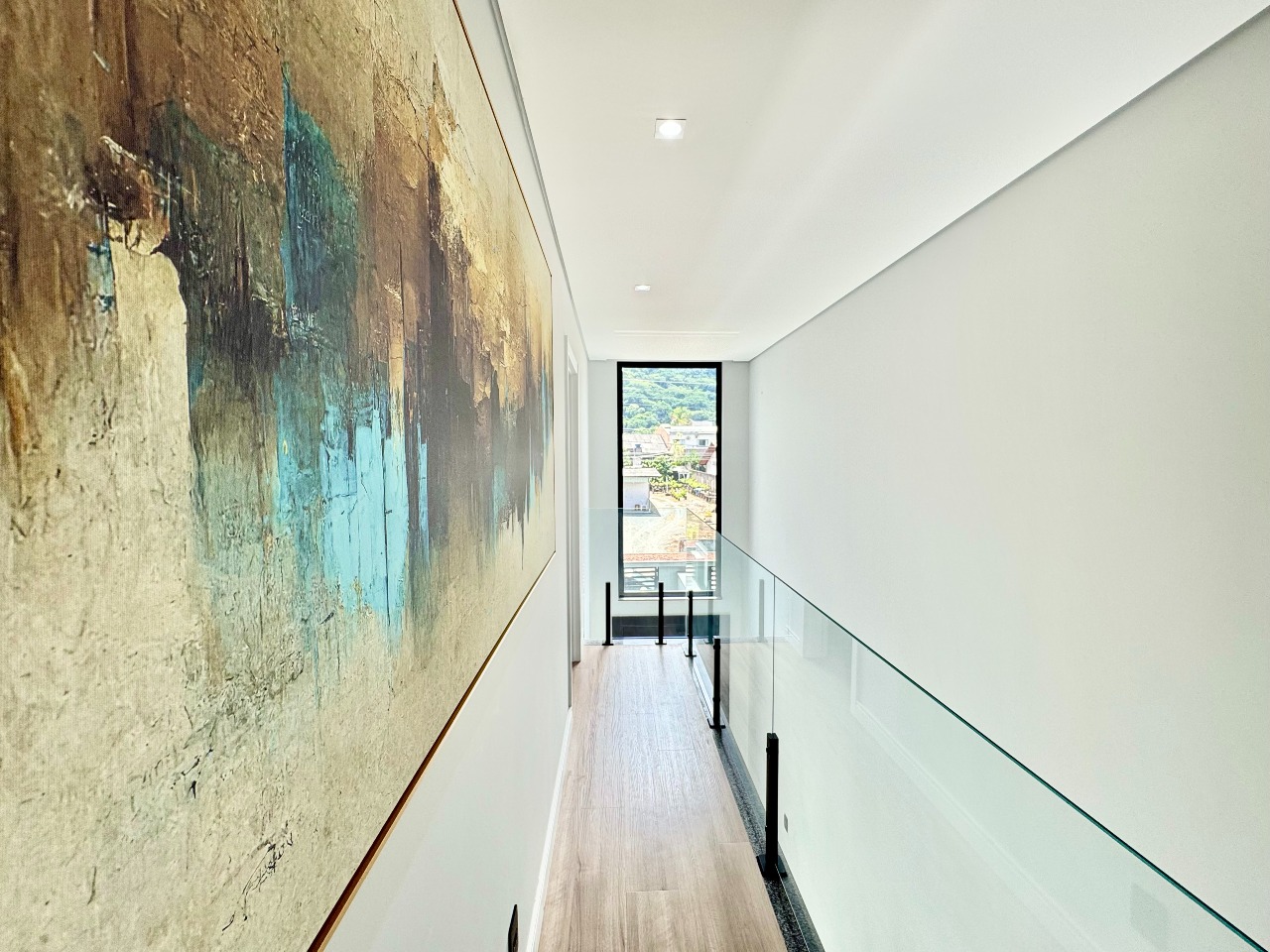Os acabamentos evidenciam o cuidado na construção, com rebaixo em gesso, piso porcelanato nas áreas sociais, piso laminado no pavimento superior e portas brancas que reforçam a sofisticação dos ambientes.