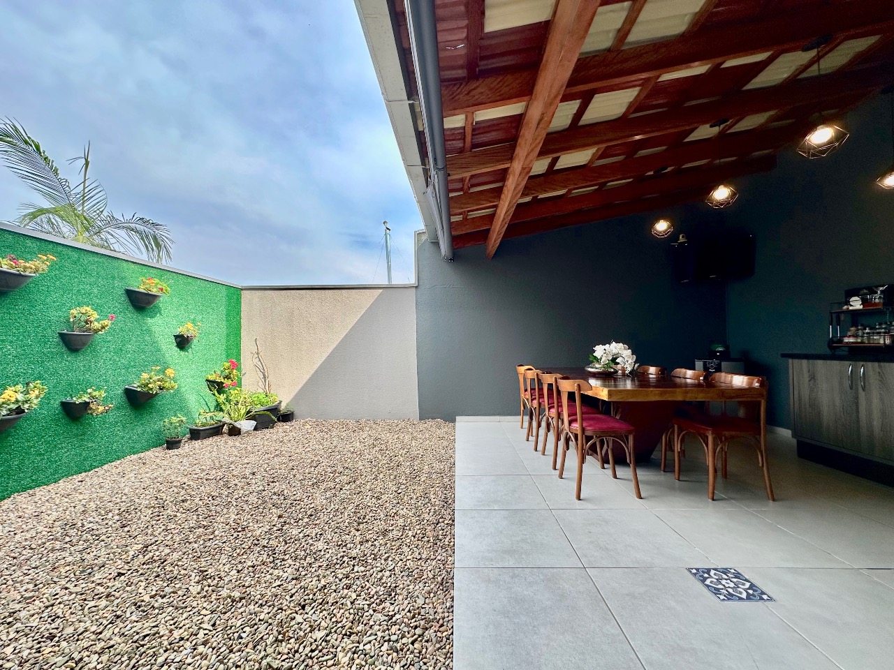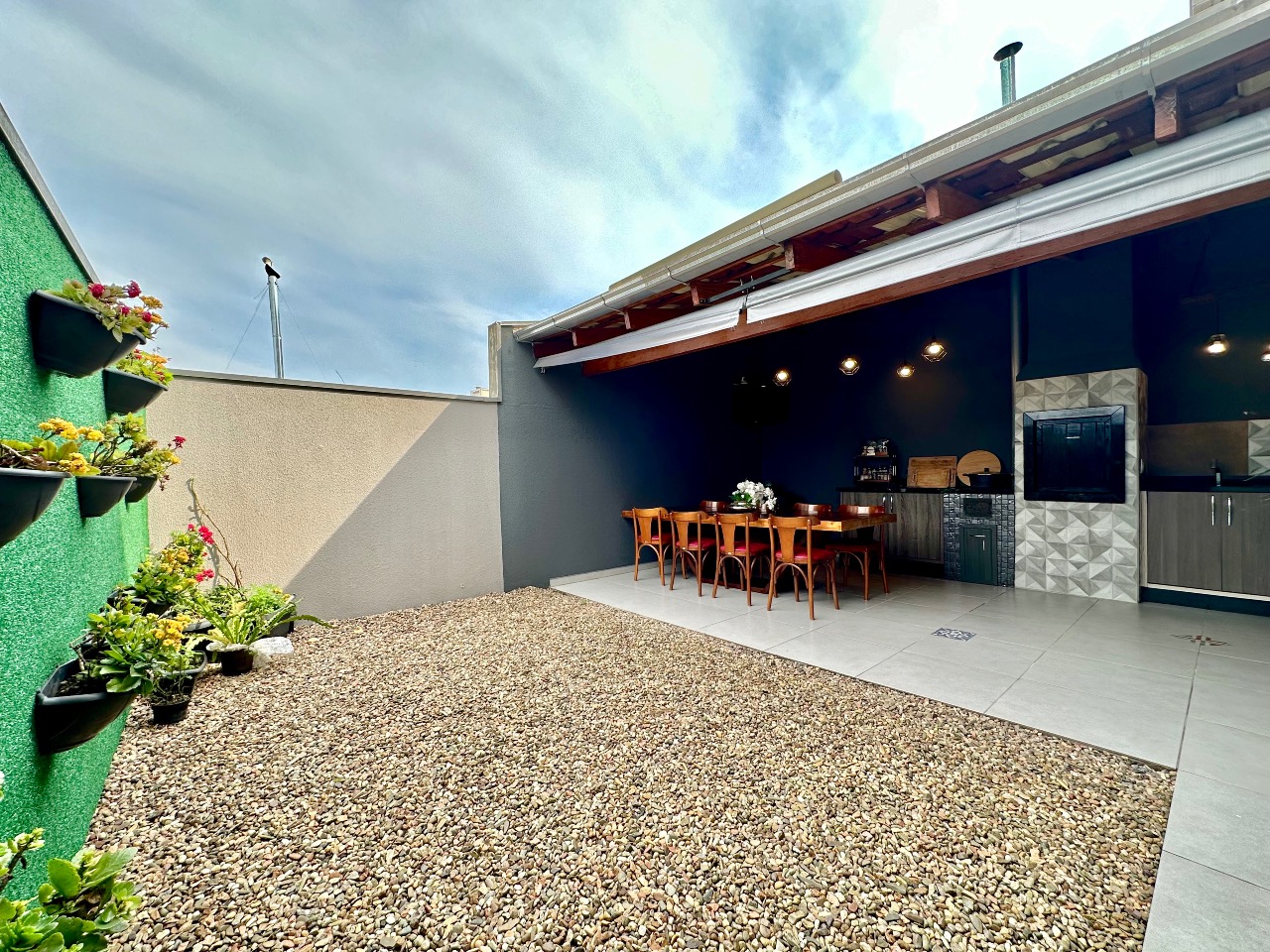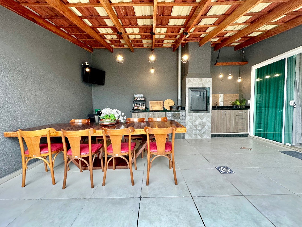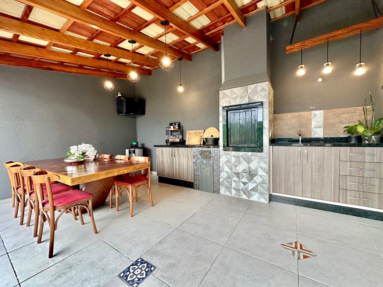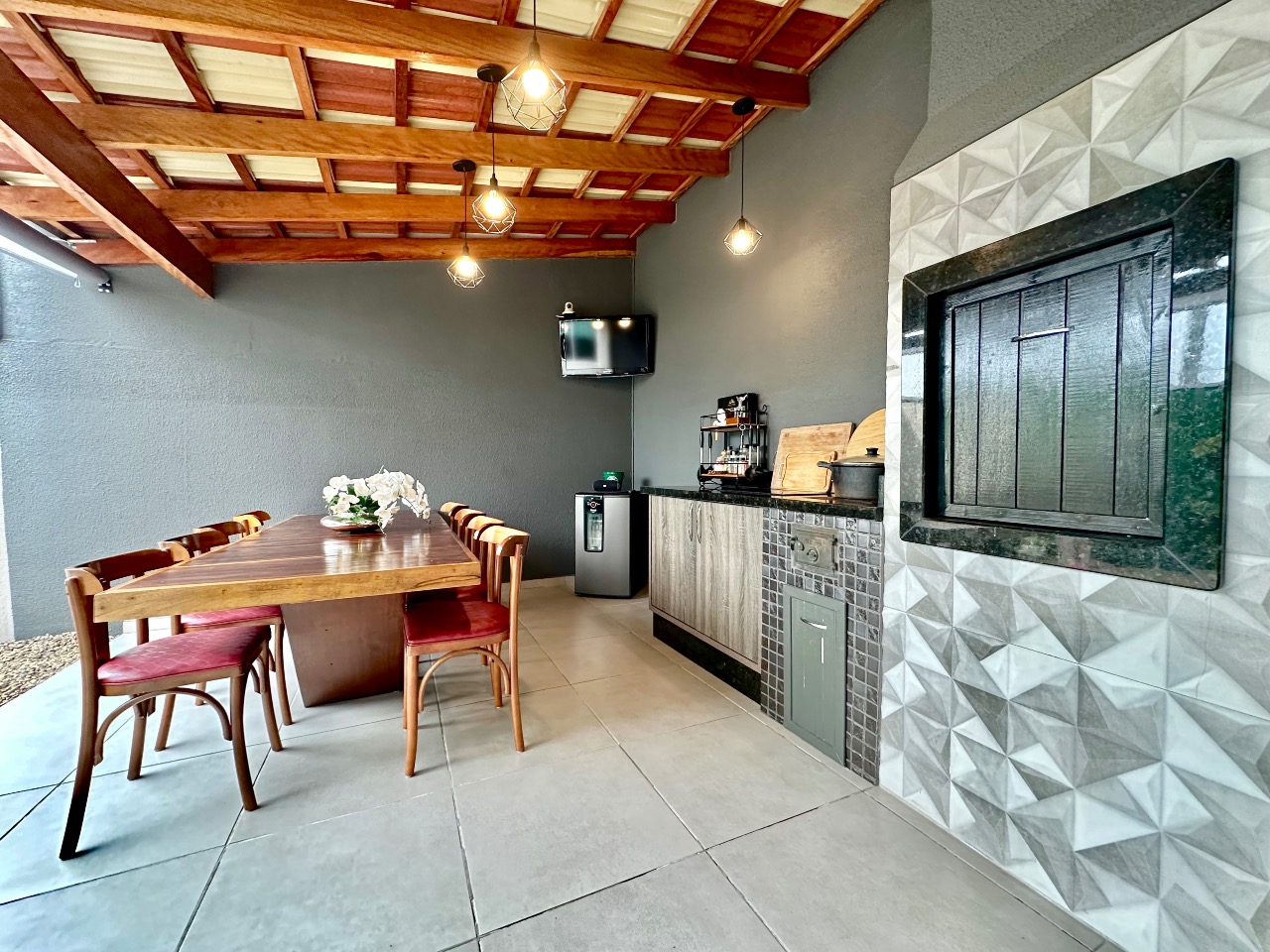 Nos fundos, um dos grandes diferenciais: uma ampla área de festas com churrasqueira, perfeita para receber amigos e aproveitar momentos especiais em família, além de sobra de terreno.