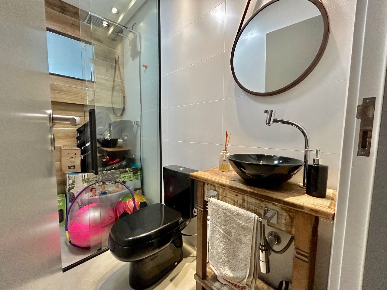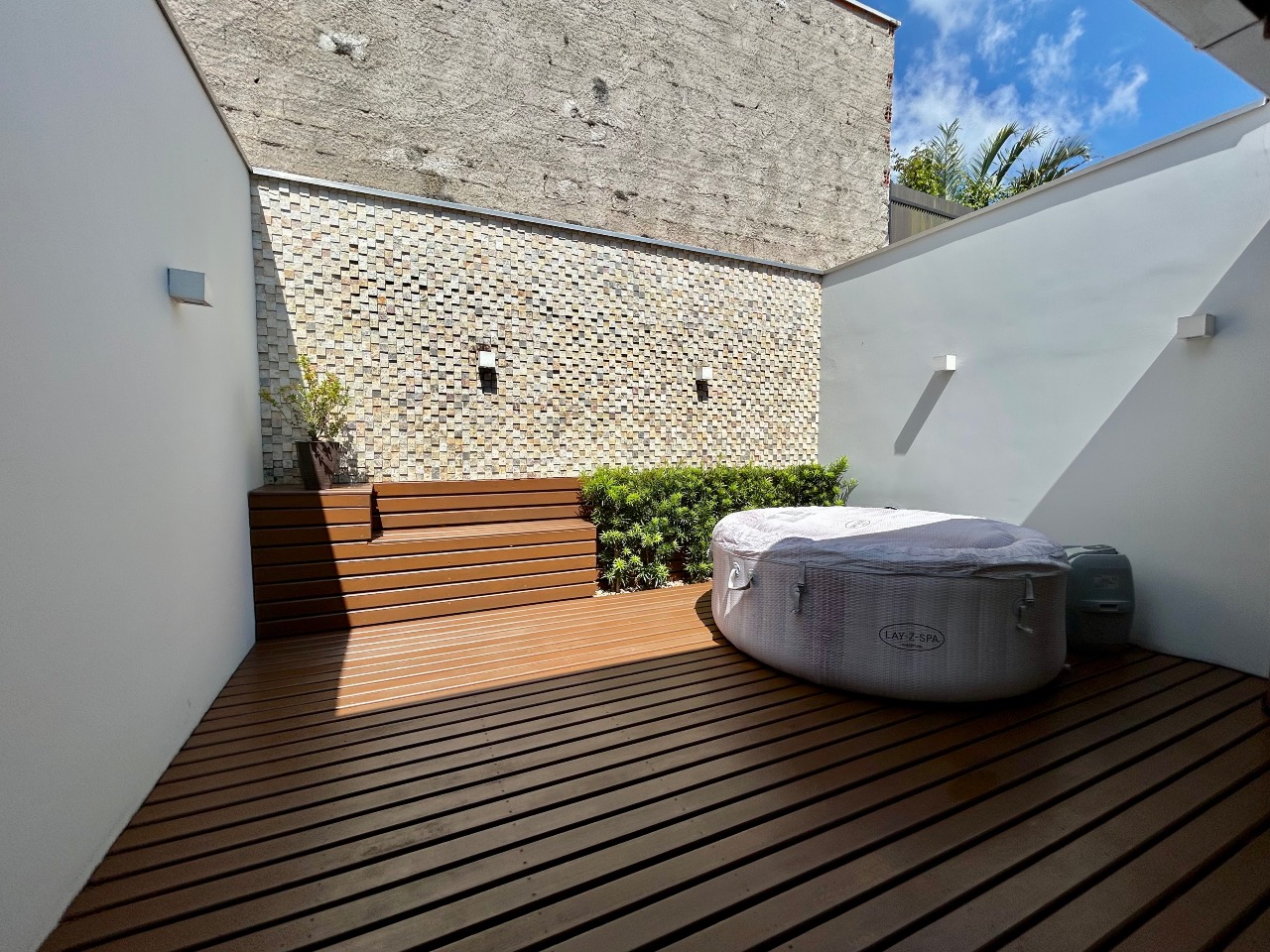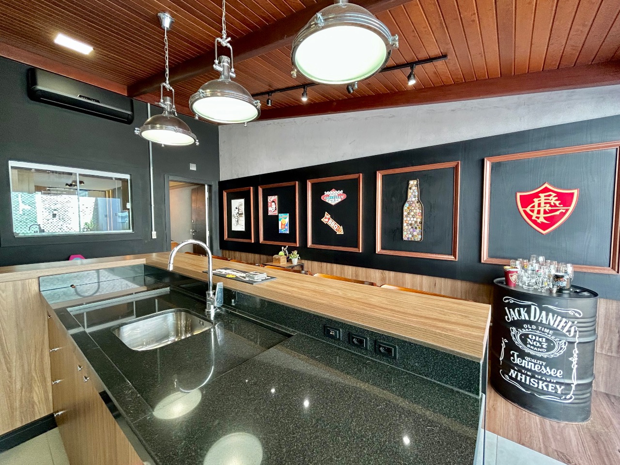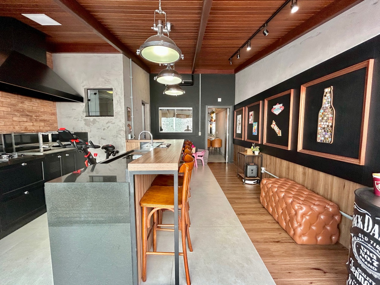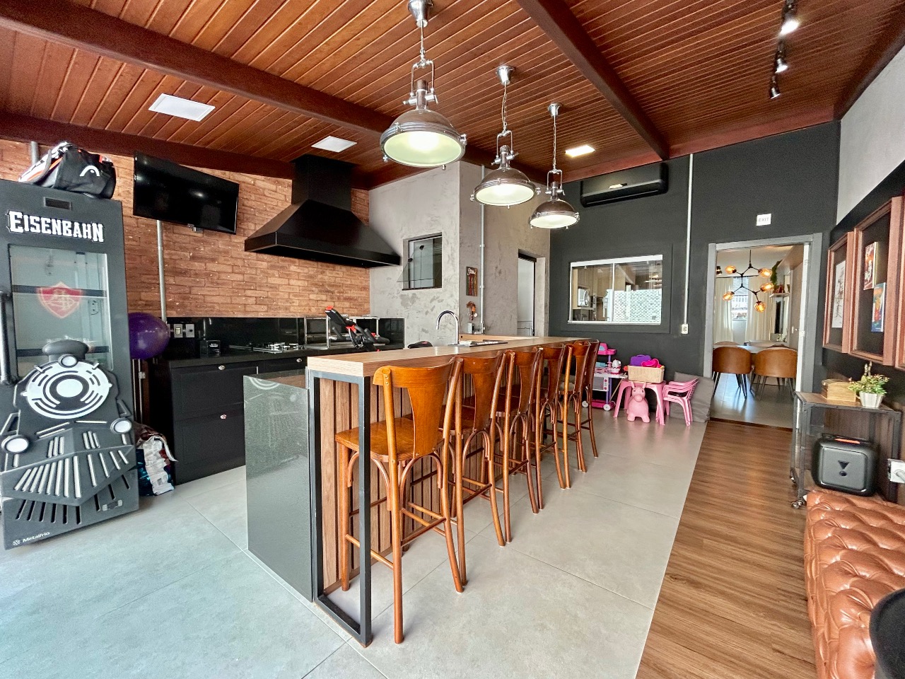 No piso inferior, conta com 2 vagas de garagem, sala de estar integrada à cozinha, banheiro social e área de serviço separada. Nos fundos, uma área de festas completa e climatizada, com decoração em estilo PUB, além de deck externo com ofurô, ideal para momentos de lazer e confraternização.