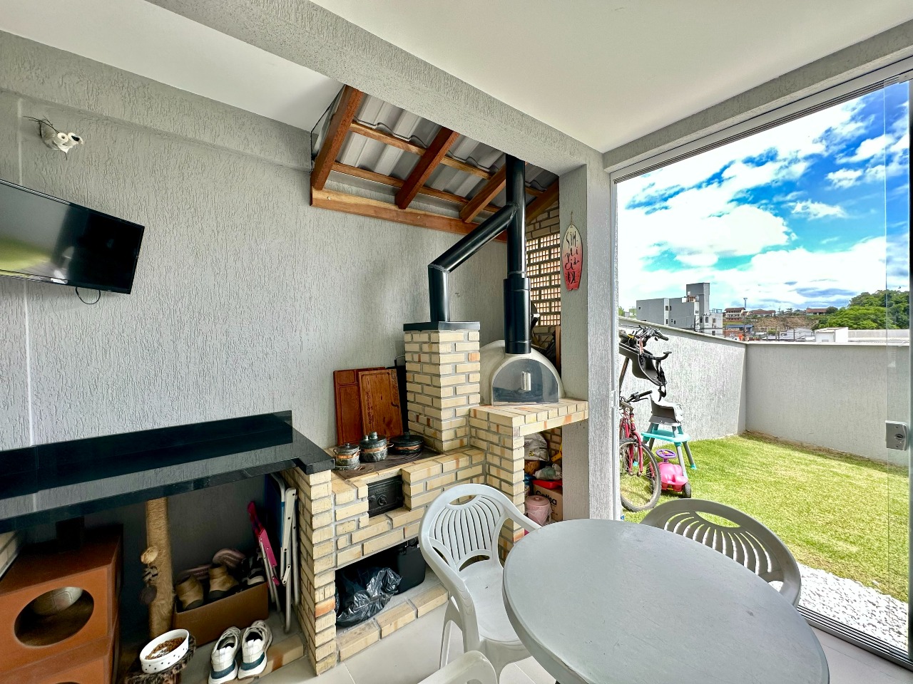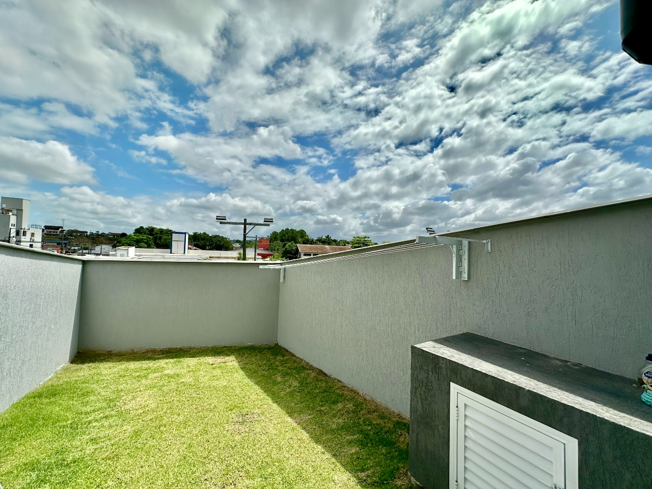 O imóvel é distribuído em três dormitórios, sendo um deles suíte, além de sala de estar integrada à sala de jantar, cozinha funcional, lavabo, banheiro social e área de serviço. Nos fundos, um espaço de aproximadamente trinta metros quadrados oferece inúmeras possibilidades para lazer, descanso ou até mesmo uma futura área de festas. O sobrado conta ainda com duas vagas de garagem, trazendo mais comodidade para a rotina da família.